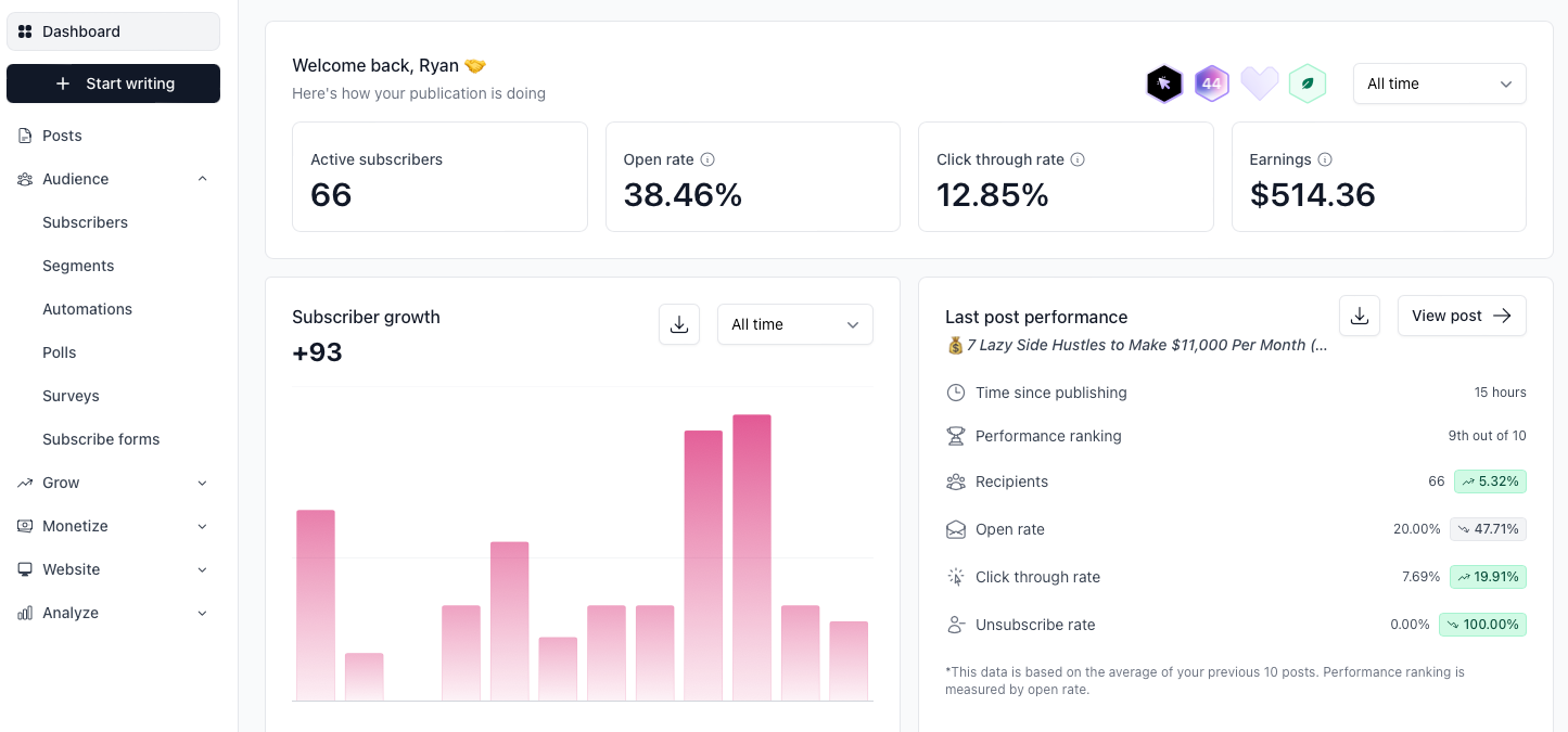 This is the main dashboard where you check how your newsletter is performing – Active Subscribers, Open Rate, Click Thru Rate (CTR) and Earnings.