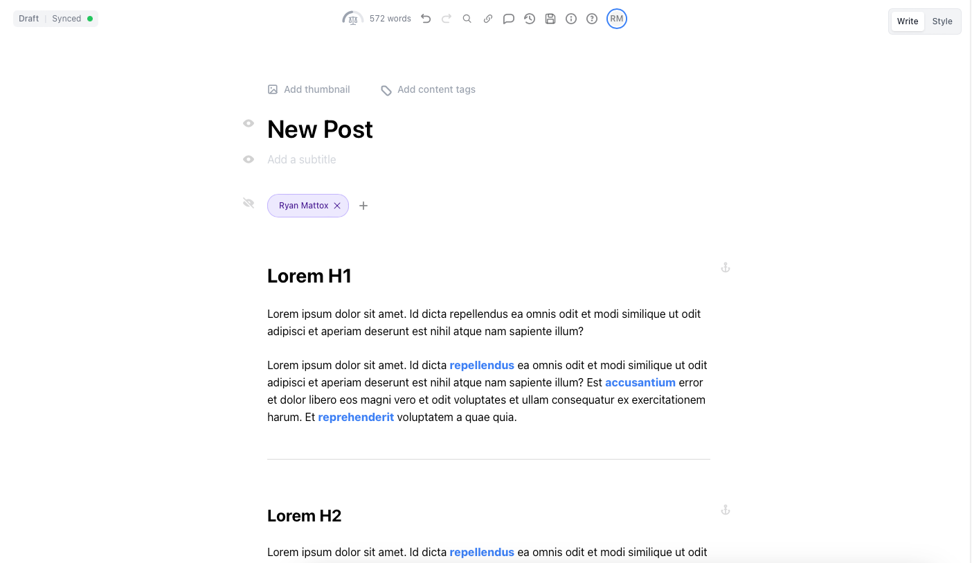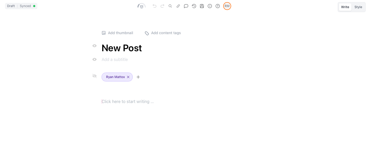 In the Dashboard, you'll find a 'START WRITING' button all the way to the top right of the screen.