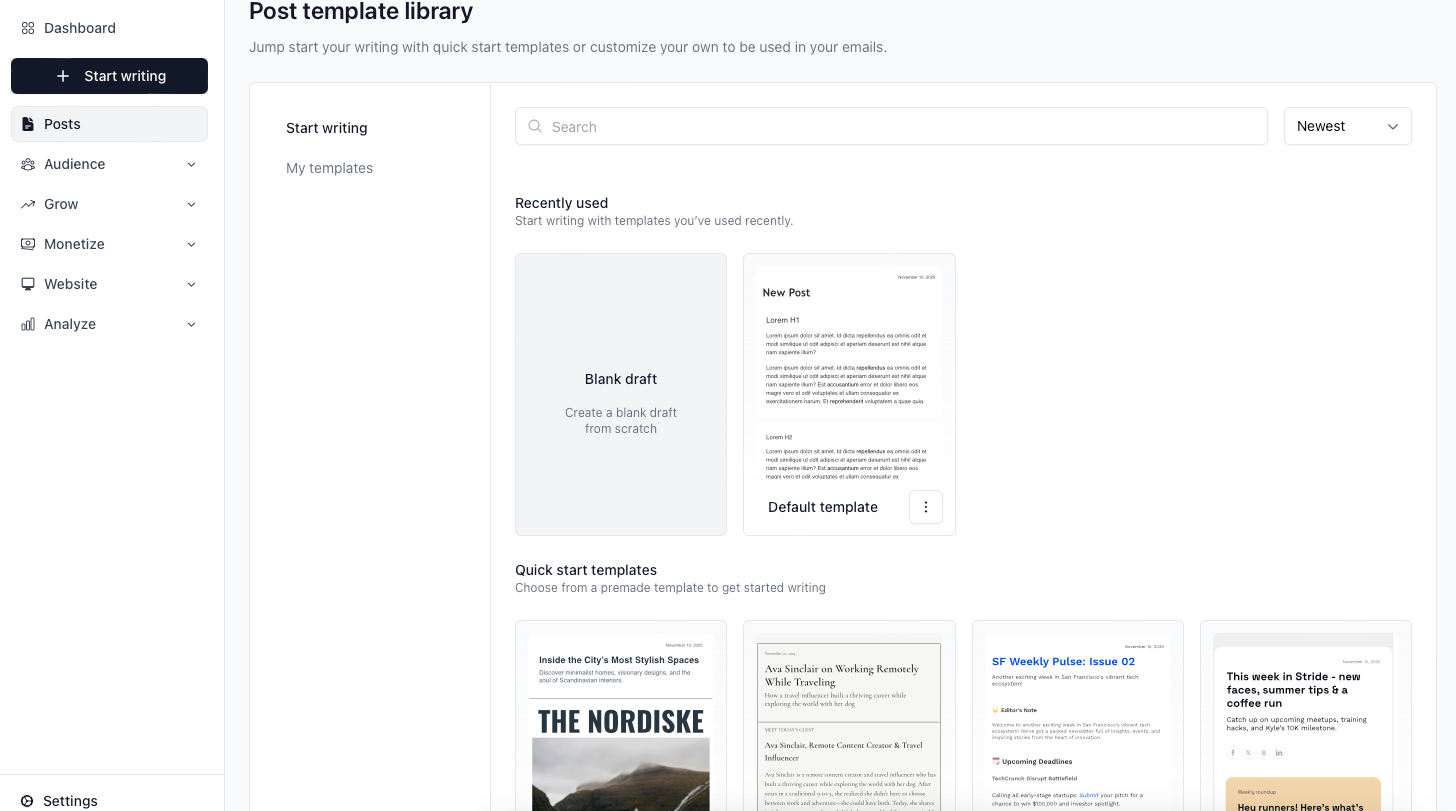 Instead if you select the Use Template selection you will be brought to the post template library. Here's where you can select the layout of post you'd like to create.