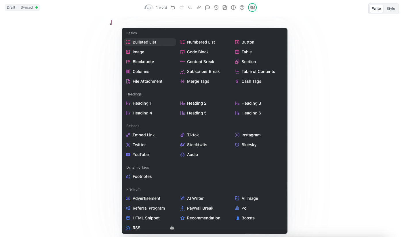 Beehiiv has dozens of ways to customize your newsletter post. By typing a forward slash ( / ) you'll be prompted with a menu that displays all the options to add to your post.