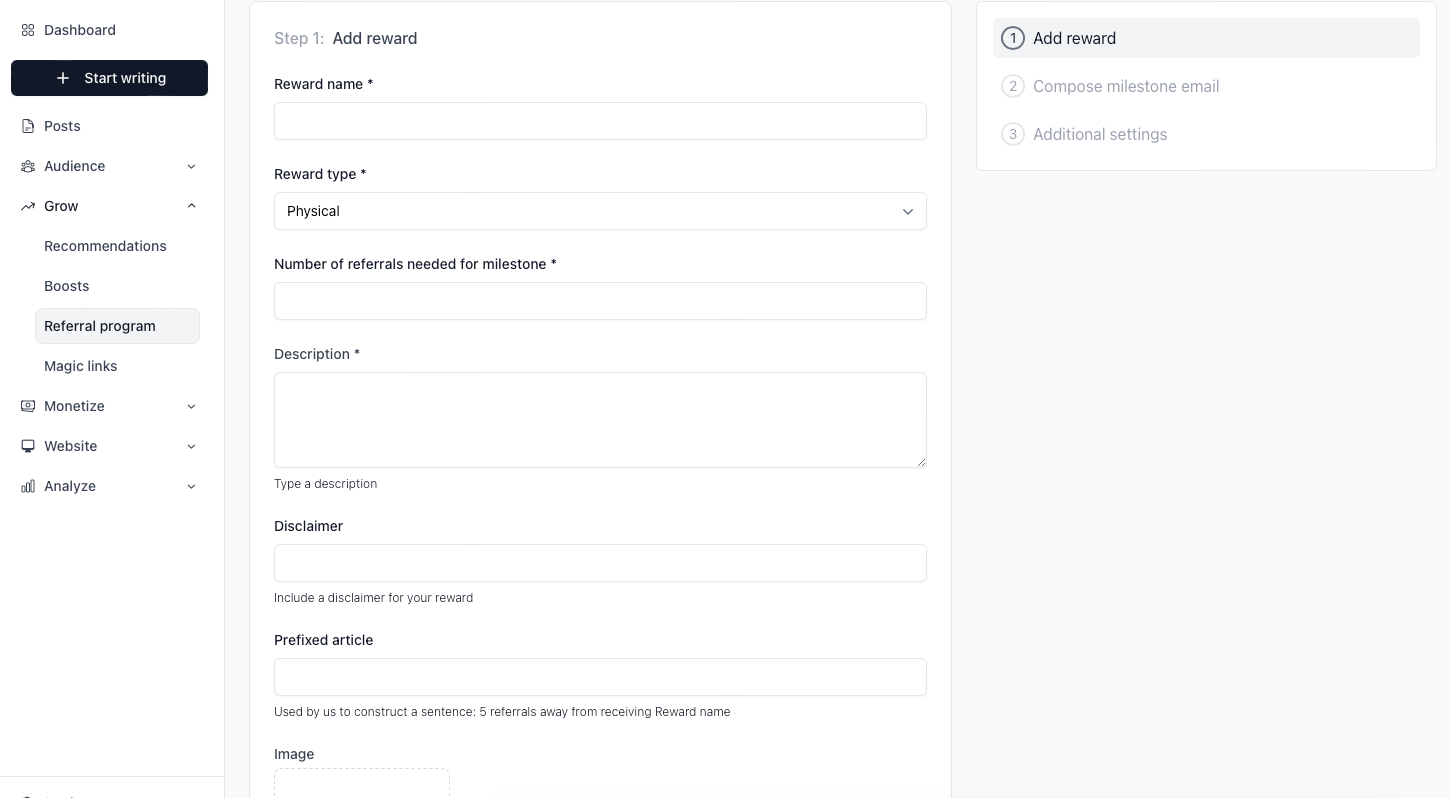 One of the coolest features on Beehiiv is the ability to create your own referral program – you get to customize all the rewards!