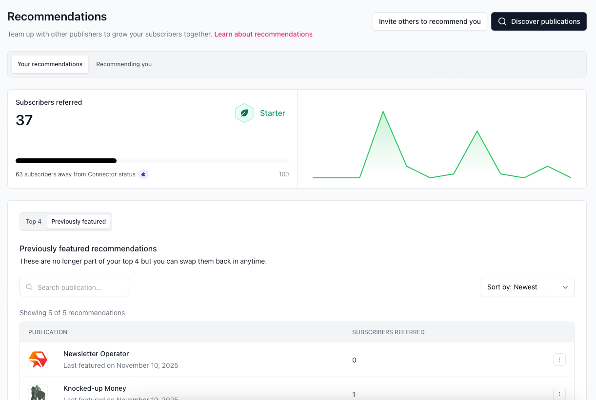 It shows you how many subscribers you've referred to other publications and who has recommended your newsletter to their audience.
