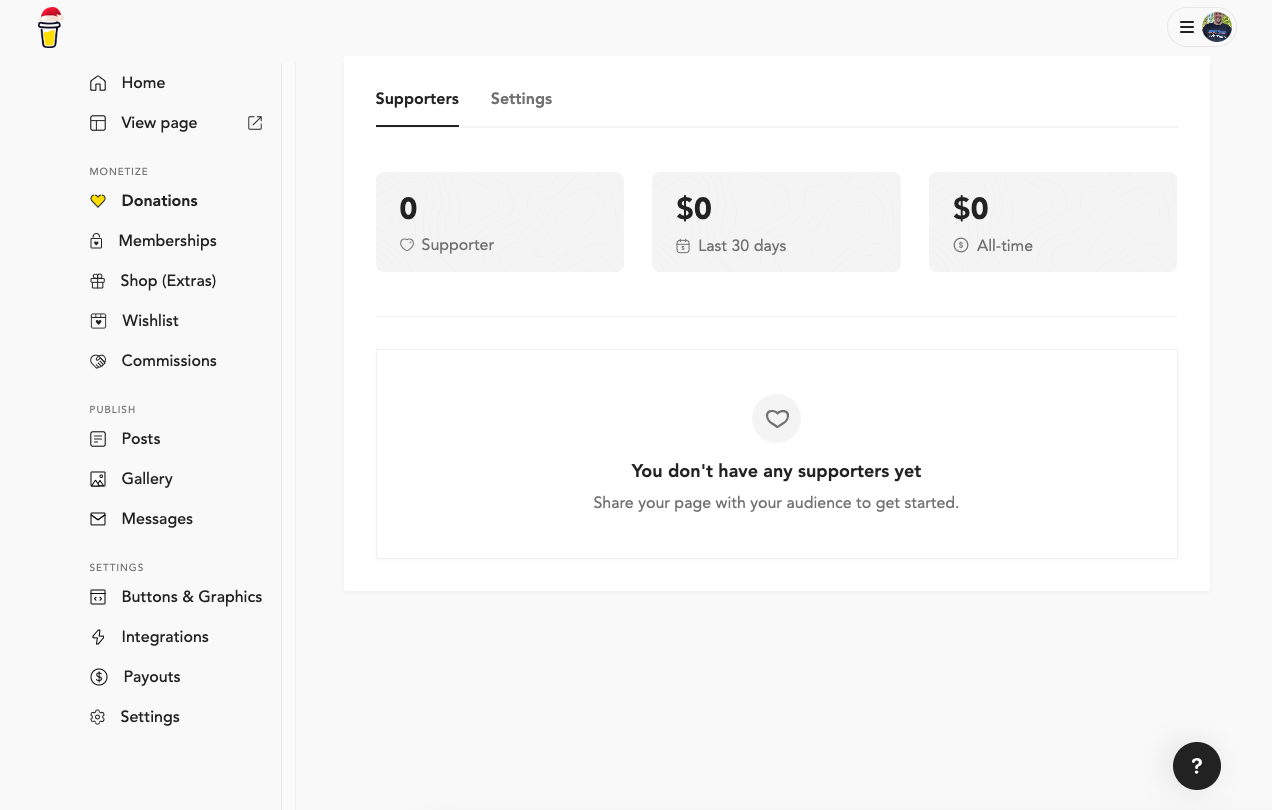 The donations page is a simple yet streamlined view of your supporters, the amount of money that was donated in the last 30 days and the amount of money donated all-time to your account.