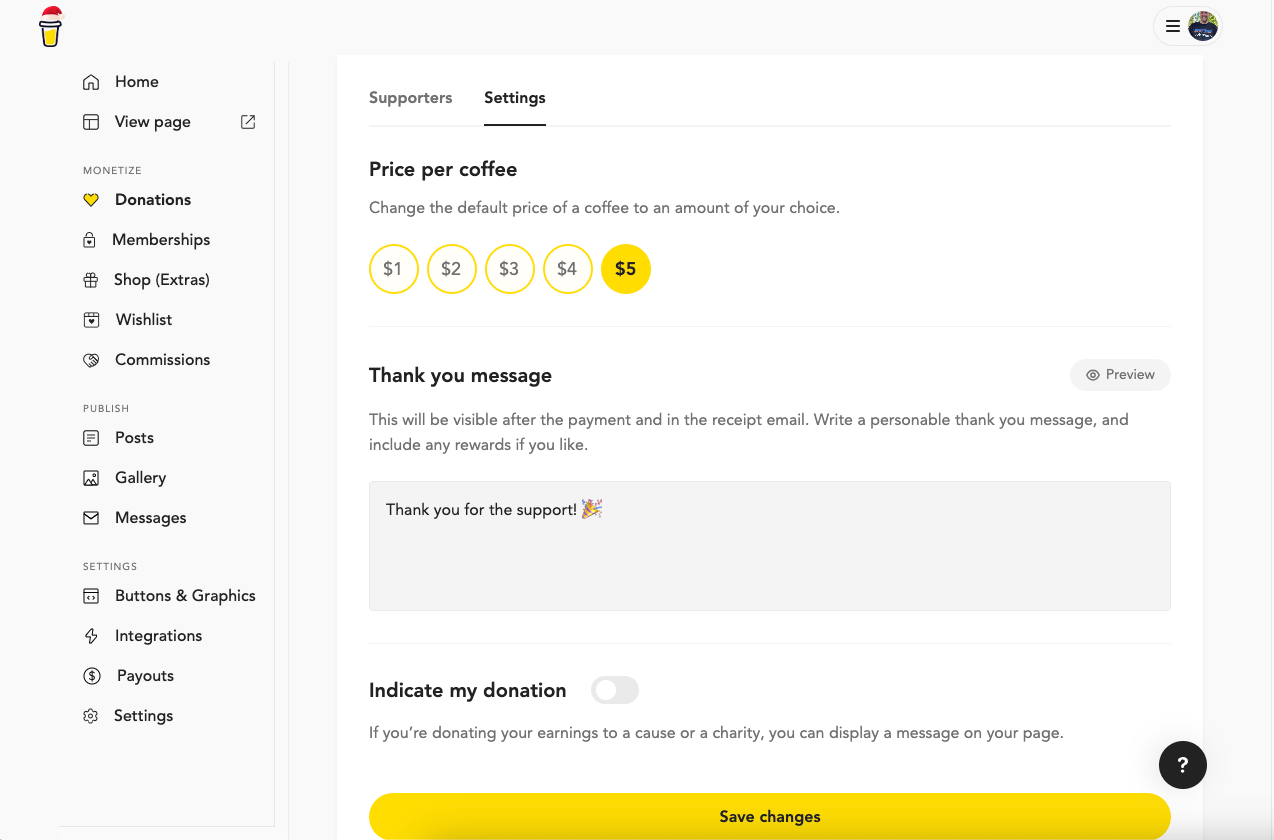 On the settings tab you can also set the price per coffee you'd like. For example, when someone donates a coffee to you, do you want to charge them $1 - $5 per one donation of coffee.