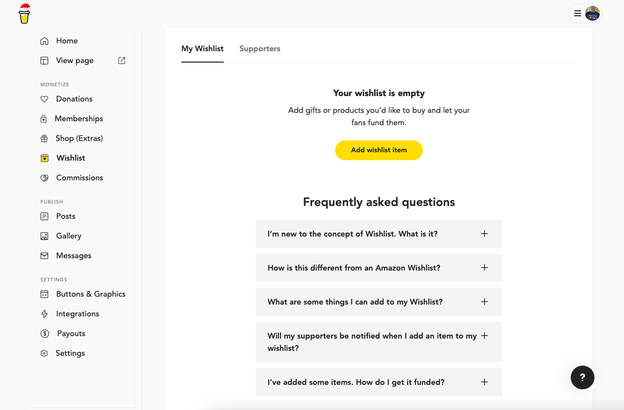 Your wishlist is a unique concept in BMC, where you can add items you would like to crowdfund by your supporters. For example, let's say you are a YouTube creator and you are in the market for a new microphone or headphones, you can add that item to your wishlist and encourage your supporters to donated money towards these items.
