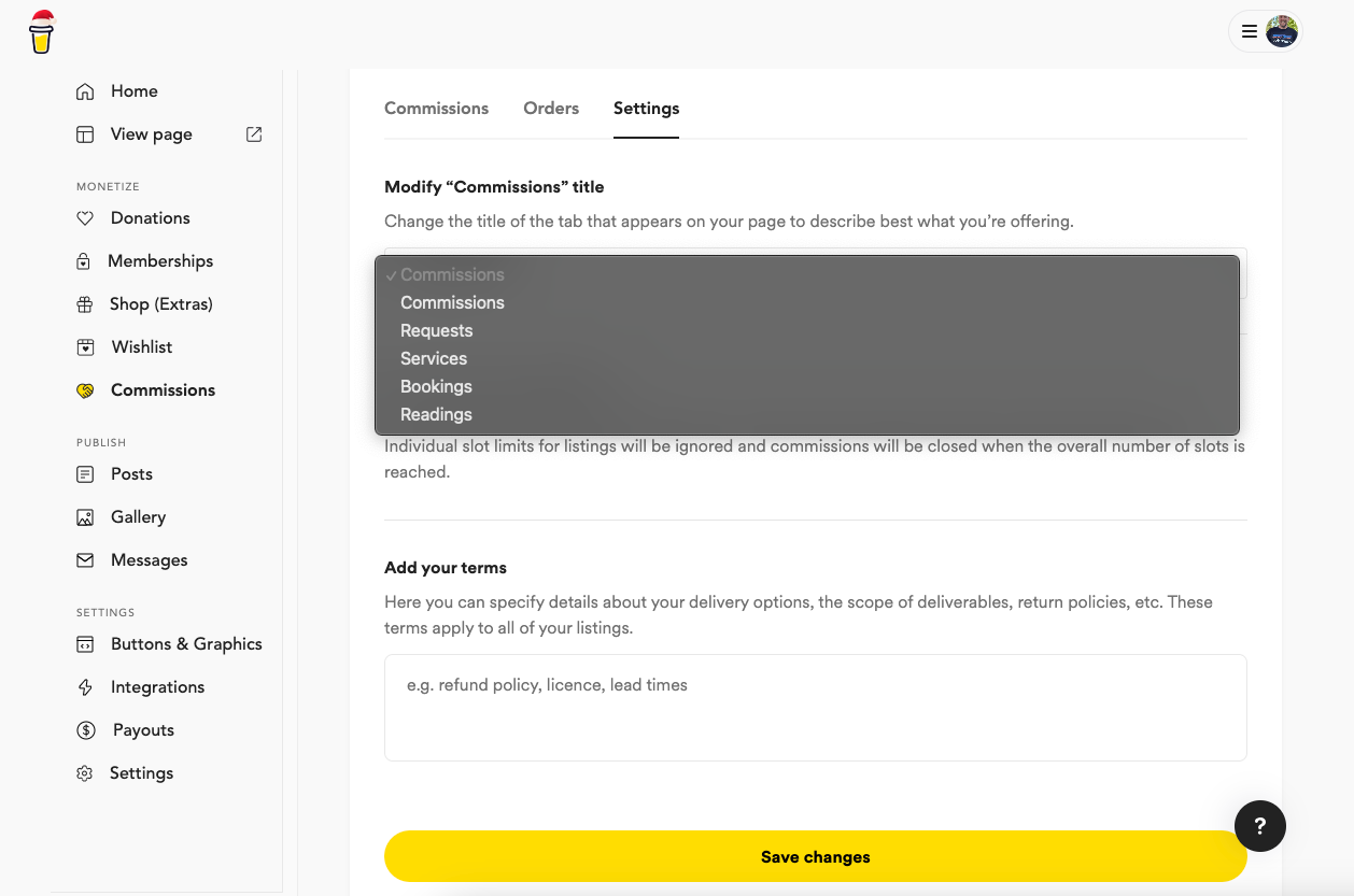 If you would rather change the verbiage from Commissions to something else such as Requests, Services, Bookings or Readings you can do that as well. It's always best practice to accurately represent what your supporters are receiving from you so the trust and loyalty remains strong.