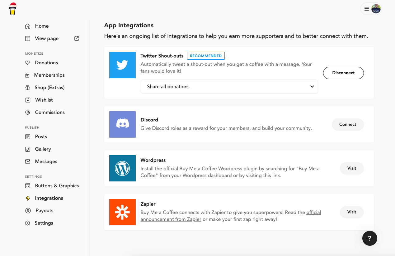 App integrations bring your promoting to the next level. If you currently use any of these applications X/Twitter, Discord, Wordpress or Zapier you are able to integrate their functionality with Buy Me A Coffee to increase donations more seamlessly.
