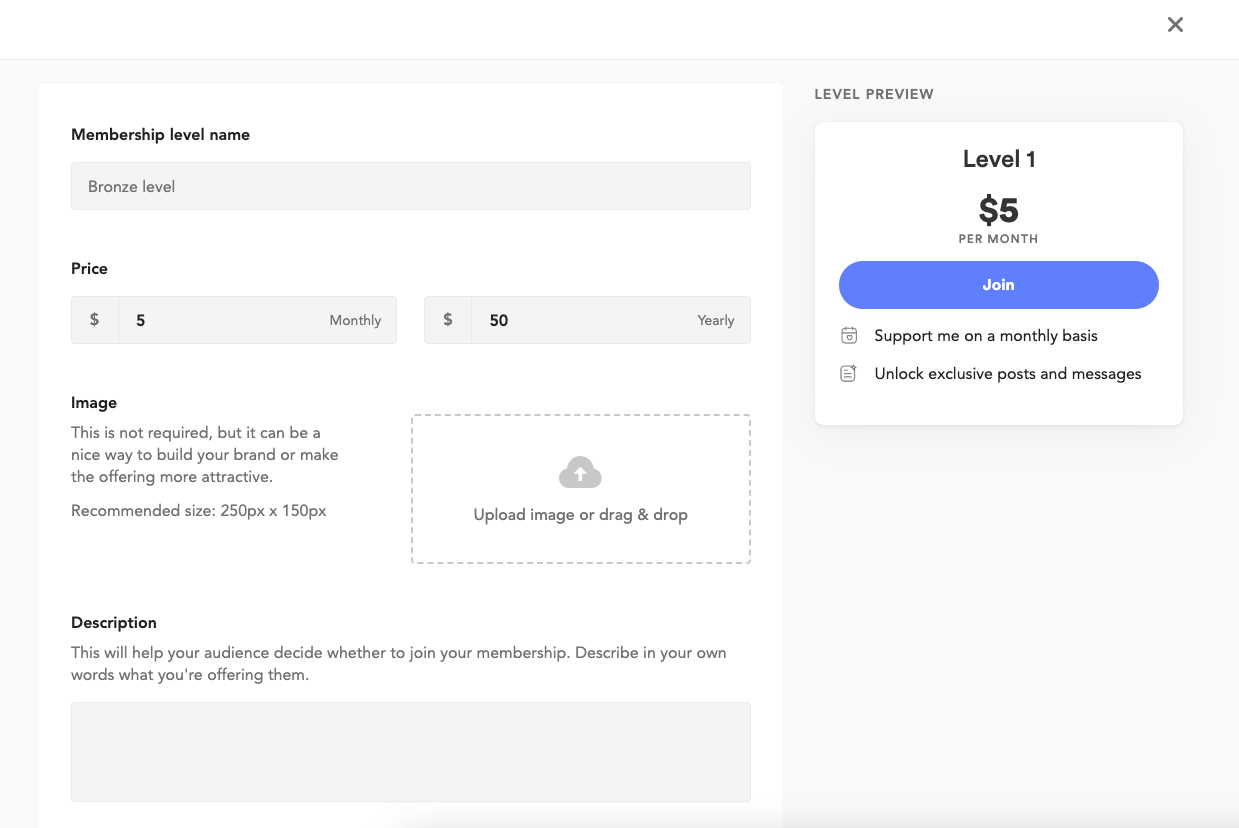 Having a clear and concise Description of all your membership levels will help your loyal supporters decide if they'd like to join or not. Be sure to be honest when representing the perks/extras they will receive. Don't lie or deceive your audience, you don't want to lose their trust just because you mislead them with your description.