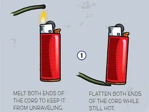 1. Melt both ends of the paracord with the lighter. While they are still hot, carefully flatten both ends with the bottom of the lighter. This will make it easier to pass the cord through the watch or bracelet. The best size watch has about 5/8″ between the lugs (where the pins go).