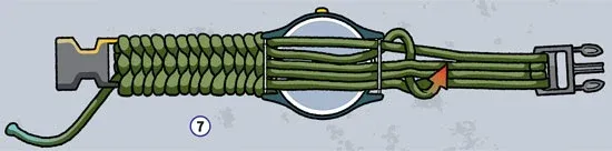 7. When you reach the watch and your wraps are tight, pass the cord through the pins and under the watch. Continue wrapping and tightening the paracord until you reach the male end of the buckle.