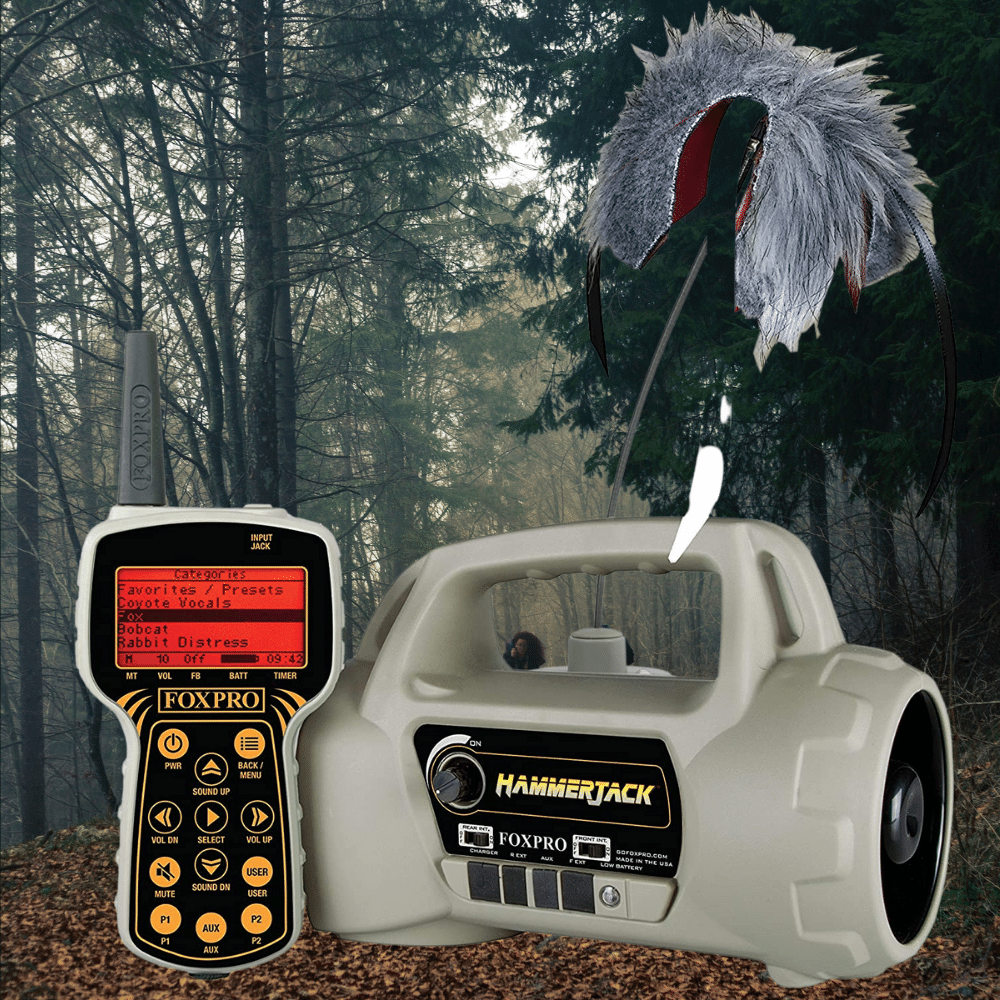 Looking for an easy-to-operate, portable, and lightweight call that delivers incredible volume? Look no further than the FOXPRO HammerJack. This call comes standard with 100 high-quality preloaded sounds and 100+ FREE sound files that you can easily download. It also can hold up to 300 sounds, so you can tailor your calls to any situation. The HammerJack features dual-amplified speakers to deliver unbelievable volume and realism. The front horn speaker handles your coyote vocalizations and common distress sounds with ease, while the rear cone speaker takes care of the low-frequency sounds like bear growls, owl hoots, and even mountain lion screams. When combined, they provide clear, high-quality sound that will fool even the wariest of prey. If you need even more volume, the Hammerjack allows you to connect two external speakers for maximum volume capabilities. Other accessories include a charge jack, an auxiliary jack, and the Foxjack 4 unit with the FOXPRO Fuzzy Wuzzy topper. Don't go another hunting season without the HammerJack!
